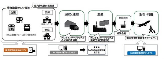 株式会社レボインターナショナル(本社:京都府京都市、以下「レボインターナショナル」)及び株式会社NTTデータ(本社:東京都江東区、以下「NTTデータ」)が推進する航空分野におけるCO2排出量の削減に資するプロジェクトでレボインターナショナルが愛知県田原市に立地するSAF製造プラントを拠点に、本地域で地産地消SAFサプライチェーンを構築する。また、NTTデータが開発するトレーサビリティシステムを活用し、廃食油等の原料の回収・SAF製造・輸送等に伴うCO2排出量を正確に把握する。これらの取り組みを通じ、原料となる廃食油等の回収からSAFの製造、供給、利用まで