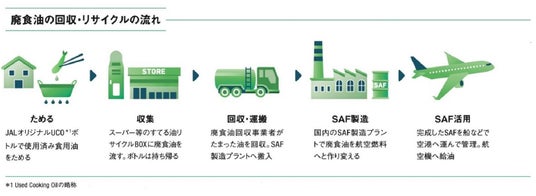 航空機の脱炭素化を進めるため、ご家庭の廃食油を回収し、SAFへの再利用を呼びかけるJALが進める