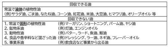 ※店舗で回収できる油は次の通りです。ご確認のうえ、店舗にお持ちください。