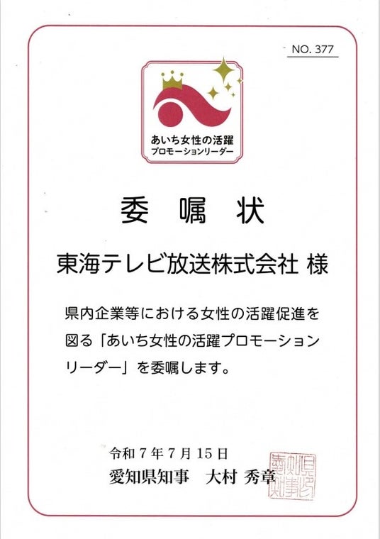 東海テレビ放送株式会社(本社:名古屋市東区、代表取締役社長:林泰敬、以下「当社」)は、2025年7月15日(火)に大村秀章愛知県知事より「あいち女性の活躍プロモーションリーダー」に委嘱されましたので、お知らせいたします。