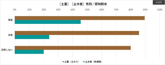 - 男性⇔女性の「土嚢」認知率は大きく変わらない。一方、「止水板」は20ポイント以上と倍近くの差