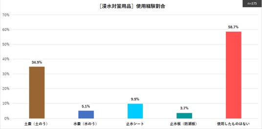 「使用したものはない」との回答が最多「58.7%」で50%を超え、「土嚢(土のう)」でも「34.9%」と約1/3にとどまっています。