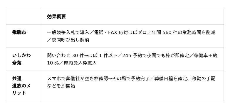 ■ 飛騨市役所 市民福祉部 市民保険課のコメントスマート火葬予約導入で、葬儀社さんは現場で火葬炉の空き時間を即確認・即予約でき、市へ電話する手間が無くなりました。私たち職員も窓口や宿直中の電話対応が激減。年間約 560 件のやり取り時間が大幅に削減され、火葬予約が迅速・確実になったと実感しています。窓口が混雑していても予約電話や火葬時間の調整の対応に追われることが無くなった点もありがたいです。
