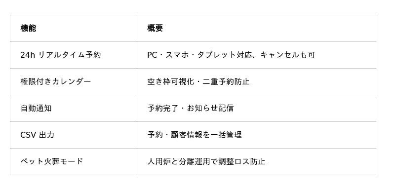1日最大30 件あった電話問い合わせがほぼゼロになり、業務中断が解消しました。24 時間予約できるため夜間でも枠が即時確定し、火葬炉稼働率は体感で約1割向上。入力必須項目を絞ったシンプル設計で高齢の葬儀社さんにも扱いやすく近隣のご葬家・葬儀社さんに迅速な火葬手配を提供中です。空いた時間を活用して利用者様へより良いサポートが行えるよう業務改善ができ、今後も地域の為に精進していきます。