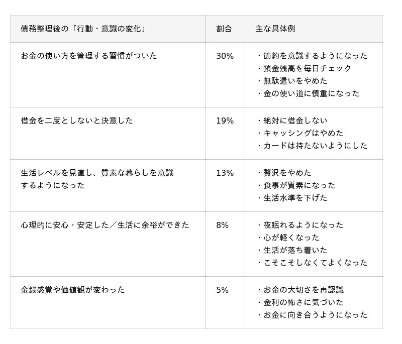 次いで多かったのが、「もう二度と借金しない」といった強い決意や、キャッシングやクレジットカードの利用を断つといった行動の変化。これは再発防止につながる重要な意識の変化といえます。