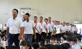 甲子園で「岐商魂」発揮を 県岐阜商高ナイン壮行会 生徒900人が激励 スポーツ 高校野球 2025年7月30日 19:19 優勝旗とともに堂々と行進する選手ら=岐阜市則武新屋敷、県岐阜商業高校 応援部のエールを受けて校歌を歌う選手ら=岐阜市則武新屋敷、県岐阜商業高校 第107回全国高校野球選手権大会に3年ぶり31度目の出場を決めた県岐阜商業高硬式野球部の壮行会が30日、岐阜市則武新屋敷の同校で行われ、生徒ら約900人がナインの夏の甲子園での活躍を願い、激励した。 藤井潤作監督、上畑将部長に続き、... 全文:447文字 この記事をお読みいただくには「デジタルプラン」または「宅配+デジタルプラン」の会員登録が必要です。無料会員の方はログインしてマイページからコース変更してください。デジタルプランまたは宅配+デジタルプランをご登録中の方はログインしてください。 岐阜新聞デジタル会員に登録すると 無料会員向け記事が読める ニュースレターで最新情報が受け取れる デジタルプラン、宅配+デジタルプランなら Webオリジナルコンテンツが読める 紙面ビューアが読める チケットの先行発売に参加できる お得なクーポンが使える サービス内容や料金をもっと詳しく 新規登録ページ ログインページ トップ 岐阜のニュース 高校野球 甲子園で「岐商魂」発揮を 県岐阜商高ナイン壮行会 生徒900人が激励 関連記事 【森嶋ルポ】どん底のチーム状態から頂点へ 県岐阜商打線、帝京大可児・富田を打ち崩す【高校野球岐阜大会・決勝】 【森嶋ルポ】低反発バット時代の定番「低く強い打球」、今夏も勝利の鍵に【高校野球岐阜大会・総評】 【森嶋ルポ】帝京大可児・富田、中京・鈴木との投手戦制す 県岐阜商と関商工は初回で明暗【高校野球岐阜大会・準決勝】 【森嶋ルポ】中京が「低く強い打球&走塁」でプロ注目右腕を撃破し4強! 県岐阜商は鍛治舎前監督絶賛の初回集中打で圧倒 【高校野球岐阜大会・準々決勝】 決勝の詳報 夏の高校野球岐阜大会 「公共交通フェスタ」岐阜市で8、9日開催 新車両のデザイン発表も おすすめ記事 祝!連載100回、最もよく読まれた記事は 注目を集めたのはLRT? 旅? あの新幹線?【みのひだ乗り物探訪 第101回】 名馬ラブミーチャンの銅像完成 岐阜・笠松町役場前 馬主のドクターコパさんが寄贈 エヴァンゲリオンのメカニックデザイナー・山下いくとさん、秘話と地元愛語る 在住の大垣市でトークライブ 「公共交通フェスタ」岐阜市で8、9日開催 新車両のデザイン発表も