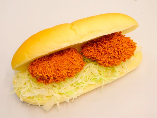 ベビースターを衣にして揚げたチキンをコッペパンにサンド。ほおばるとベビースターの香ばしいチキンの風味が広がり、揚げチキンの美味しさを引き立てています。