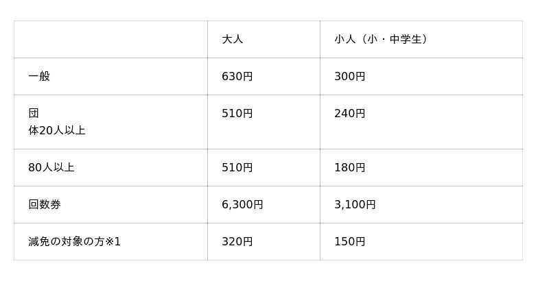 ※1 身体障害者手帳、療育手帳、精神障害者保健福祉手帳をお持ちの方は入館料が割引となります。またそれぞれの方に介護が必要な場合は、介護の方1名様の入館料を割引させていただきます。