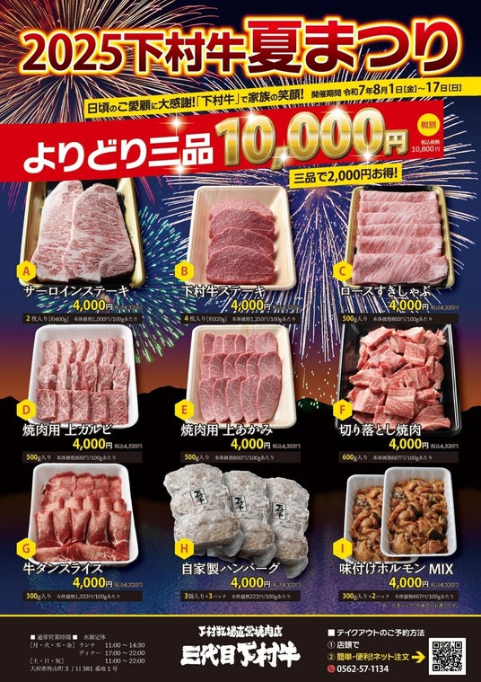 株式会社下村畜産食肉(本社:愛知県大府市、代表取締役社長:下村知士)は、当社が運営する「下村牧場直営焼肉店 三代目下村牛」において、昨年に続き「下村牛夏祭り」を実施いたします。本企画は、お好きな3品を10,000円(税込10,800円)でご提供する企画です。毎年ご好評をいただいており、「今年もやりますか?」といったお問い合わせも多く、地元の皆さまをはじめ、多くのお客様にご満足いただいております「A5ランクのお肉がこの価格で提供されるなんて!」と驚きの声も多く、リピーター続出の人気企画です。
