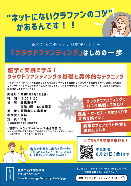 豊橋市は令和7年9月5日(金)、クラウドファンディングの基礎と具体的なコツを学べる実践セミナー「クラウドファンディングはじめの一歩」を市内の事業者を対象に開催します。好評につき第3弾です。受講者を募集していますので、クラウドファンディングに挑戦してみたいという事業者の皆さん、ぜひ応募してください。