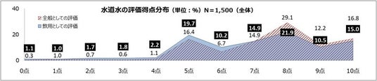【水道水への評価】全般的な水道水の評価は昨年の7.34点から今年は7.47点に、飲用としての水道水の評価も昨年の6.86点から今年は7.02点に増加しており、満足度が増している様子がうかがわれる。ただし、回答分布をみると、全般的な評価では10点満点で8点と答えた人が29.1%で最も多く、次が10点の16.8%、僅差で5点が16.4%となっているのに対し、飲用としての評価ではやはり8点が21.9%でもっとも多いが、次は5点の19.7%、10点は15.0%で7点の14.9%と大差ない。飲用としての水道の評価はやや厳しいことが読み取れる。