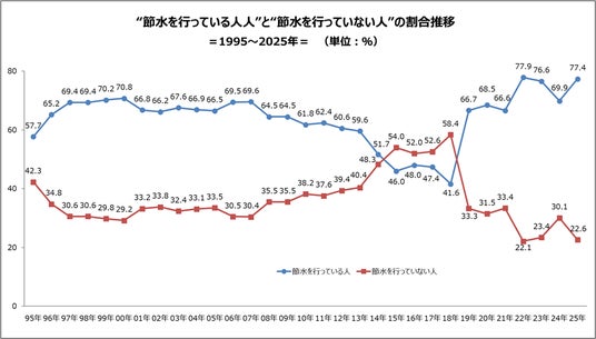 ※1995年~2018年は、「家庭における水の使い方」を問う調査として、「節水・再利用を気にせずに水を使っている」「節水・再利用を気にしながらも、特に何もせず水を使っている」「多少節水・再利用しながら水を使っている」「かなり節水・再利用をしている」の4択で実施していたため、上記グラフでは「多少節水・再利用しながら水を使っている」と「かなり節水・再利用をしている」の合計を“節水を行っている人”、「節水・再利用を気にせずに水を使っている」と「節水・再利用を気にしながらも、特に何もせず水を使っている」の合計を“節水を行っていない人”としている。