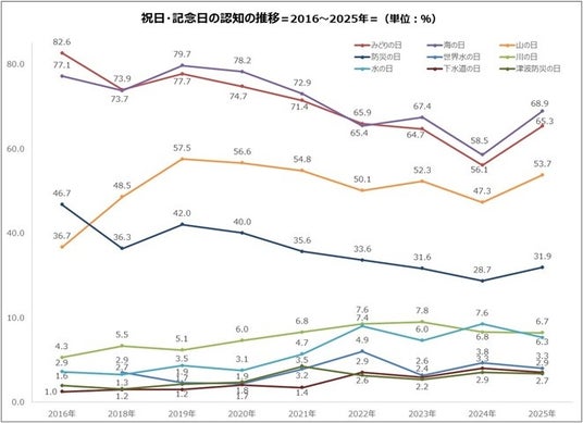 3月22日の世界水の日は3%前後、7月7日の川の日は7%前後、9月10日の下水道の日は3%前後でそれぞれ伸び悩んでいるのをみると、関連する記念日の乱立が認知の拡がりを阻んでいるようにも想像されるが、それぞれの事情もあり、行政の所管のような統一は難しいだろう。祝日ではないのに高い認知度を誇る9月1日の防災の日も、長期的には2016年の46.7%から2024年の28.7%(今年は31.9%)まで長期低下傾向にある。そうした傾向は祝日であるみどりの日や海の日でも同様なので、祝日で記念行事が行われれば認知が拡がるというものでもないのかもしれない。○○の日、が増え、祝日も増えた結果、祝日や記念日に対するわたしたちの関心そのものが薄れていると考えられる。