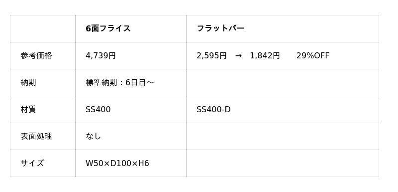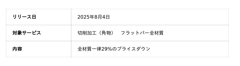 機械部品調達のAIプラットフォーム「meviy(メビー)」(サービス提供元:株式会社ミスミグループ本社)は、2025年8月4日より、切削加工(角物) (以下、切削角物)において、フラットバーの価格を全商品一律で29%値下げします。昨今、部材コストの高騰に直面する企業が増える中、今回の価格改定により、設備・建設・インフラ関連など、フラットバーを高頻度で使用する業界におけるコスト削減に貢献します。