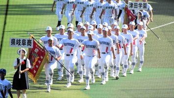 3年ぶり31度目の出場となる県代表の県岐阜商は、15番目に入場。岐阜大会の優勝旗を手にした河崎広貴主将を先頭に堂々と行進した。