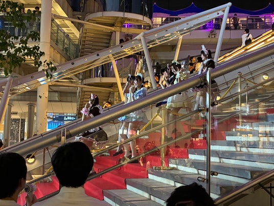 華やかなレッドカーペットには、ケイタマルヤマ氏デザインのあっとほぉーむカフェ公式メイド服と、特別な日に着用するオリジナルメイド服で登場したあっとほぉーむカフェのメイドたち