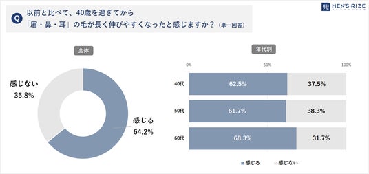 ●【40歳を過ぎてから「眉・鼻・耳」の毛が長く伸びやすくなったと思うか?】「シニア毛」の問いに対して、中高年男性の6割以上が「感じる」と回答。(64.2%)。 特に60代男性の7割が「眉・鼻・耳」の毛が伸びやすくなったと実感していることが分かりました(68.3%)。