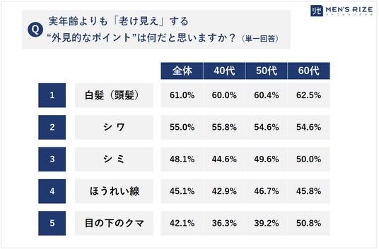 1.白髪(頭髪) 61.0% 2.シワ 55.0% 3.シミ 48.1%
