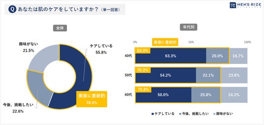 ◎「今後挑戦したい」50代が25.8%と年代別で最多に◎「ケアしている+今後挑戦したい」と【美容に意欲的な中高年男性】は約8割となった(78.4%)