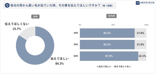 年代別では、60代男性が最多で、9割近くの87.9%が「伝えてほしい」と回答するなど、誰しも「自分の耳毛が伸びていた時は教えてほしい」と思っていることが判明しました。