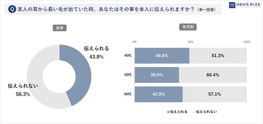◎半数以上が他人の伸びた耳毛を指摘できない結果に◎「伝えられない派」6割、「伝えられる派」4割と意見が分かれる