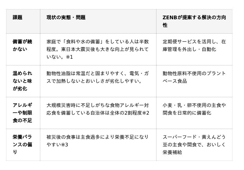 株式会社 ZENB JAPAN(ゼンブ ジャパン)(愛知県半田市、以下ZENB)は、2025 年 8 月 30 日(土)~31 日(日)に代々木公園で開催される都市型防災イベント「もしもFES渋谷2025」に出展し、食のサブスクサービスを非常時の備えに活用する「ローリングストック新習慣」を体験型ブースで紹介します。ブースでは、油脂が固まりやすい動物性原料不使用のレトルトカレーやスープ。小麦・乳・卵不使用で、食物繊維やたんぱく質などの栄養が豊富な黄えんどう豆でできたパンやスナックなど、「温めずに・誰でも・栄養を摂れる」 新しい防災・備蓄食のカタチを学べます。