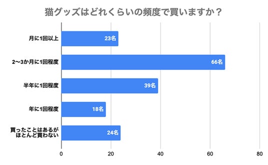 猫グッズの購入頻度を尋ねたところ、最も多かったのは「2~3か月に1回程度」(66名)。