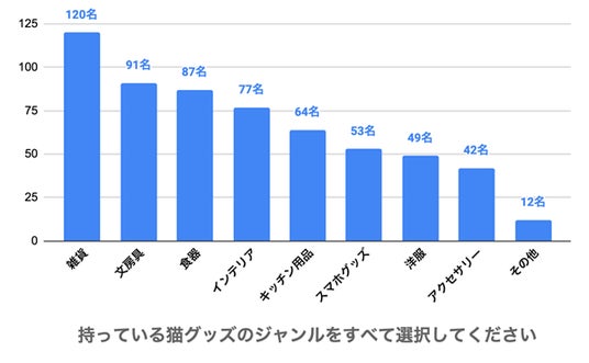 所有している猫グッズのジャンルでは、「雑貨」(120名)、「文房具」(91名)、「食器」(87名)が上位に挙がっています。