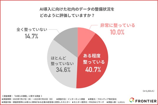 AI導入に向けた社内データの整備状況については「整っている」とする回答が半数を占め、一定のデジタル基盤が構築されている企業も着実に増えつつあります。