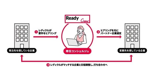 レディクルは、上場企業2,800社の利用実績がある企業と企業をつなぐビジネスマッチングエージェントです。高い傾聴力・提案力を併せ持つコンシェルジュが、システム、プロモーション他、企業のあらゆる発注業務に関わる悩みをヒアリングいたします。伺った内容を元に、レディクル独自のシステムで幅広いネットワークの中から最適な企業をご紹介いたします。受注先のパートナー企業様からのみ費用を頂いており、発注元の企業様からは一切費用を頂いておりません。