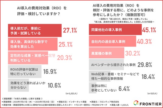 AI導入の費用対効果(ROI)を検討・評価している企業は、「同業他社の導入事例」や「自社内の過去導入事例」を参考にしていることが多く、これらの事例をもとに自社の効果測定や投資判断の基準を検討しています。