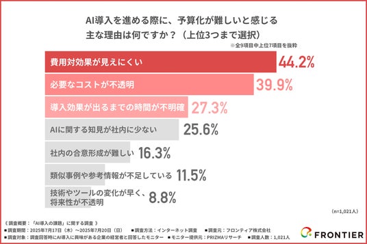 フロンティア株式会社(本社:東京都渋谷区、代表取締役社長:高橋 政裕)は、AI導入に興味がある企業の経営者を対象に「AI導入の課題」に関する調査を行いました。