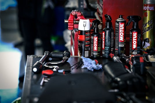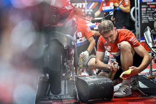 レース中はライダーの要望に応えメカニックはマシン調整を繰り返す。迅速な作業に欠かせないMOTULメンテナンスケミカル