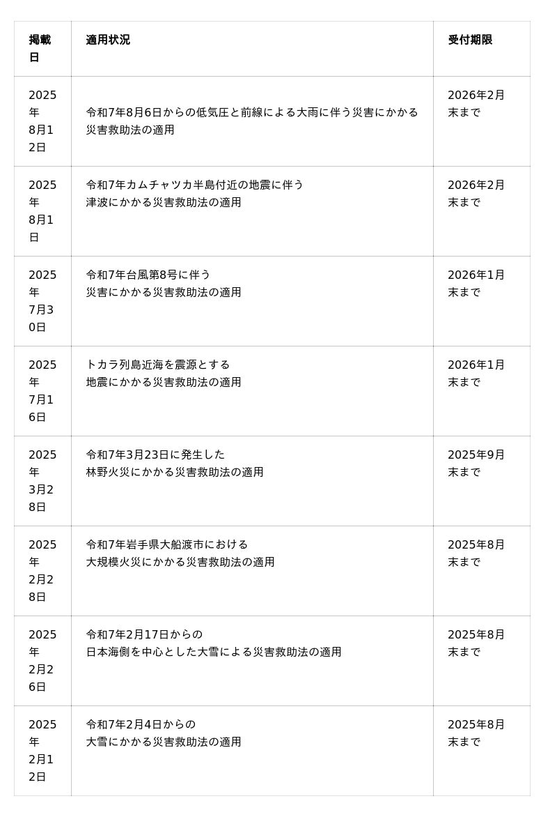 ※災害救助法適用地域の最新情報は内閣府のホームページにてご確認ください。