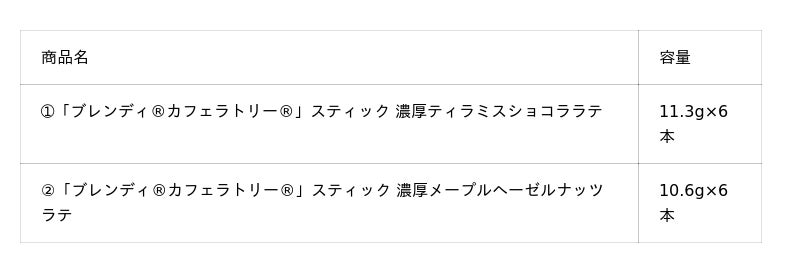 1.《「ブレンディ(R)カフェラトリー(R)」スティック 濃厚ティラミスショコララテ》は、上質なエスプレッソと香り豊かなマスカルポーネを濃厚なミルクと合わせたショコラ・ラテです。