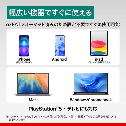 exFATでフォーマット済みのため、パソコンだけでなくスマートフォンやタブレット等のさまざまな機器で、フォーマットの変換や変換アダプターを使用せずにそのままお使いいただけます。