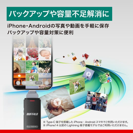 SSD-SDHU3シリーズとSSD-SDU3シリーズはともに、スマートフォン内の写真と動画をかんたんにバックアップできる無料アプリケーション「写真バックアップ」に対応しています。