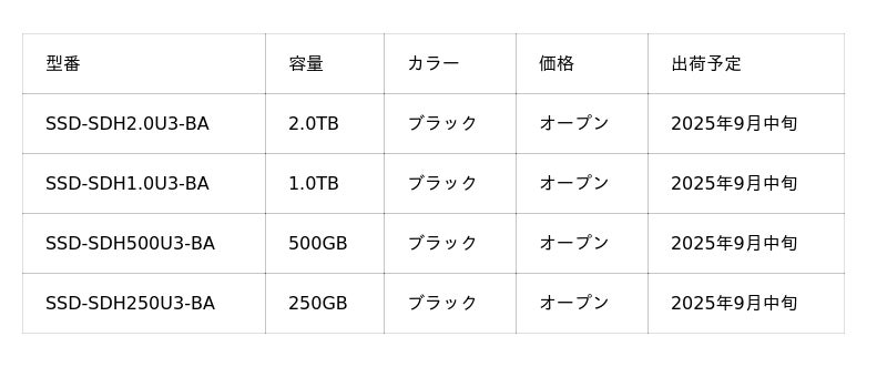 SSD-SDHU3シリーズ(容量:2.0TB、1.0TB、500GB、250GB)