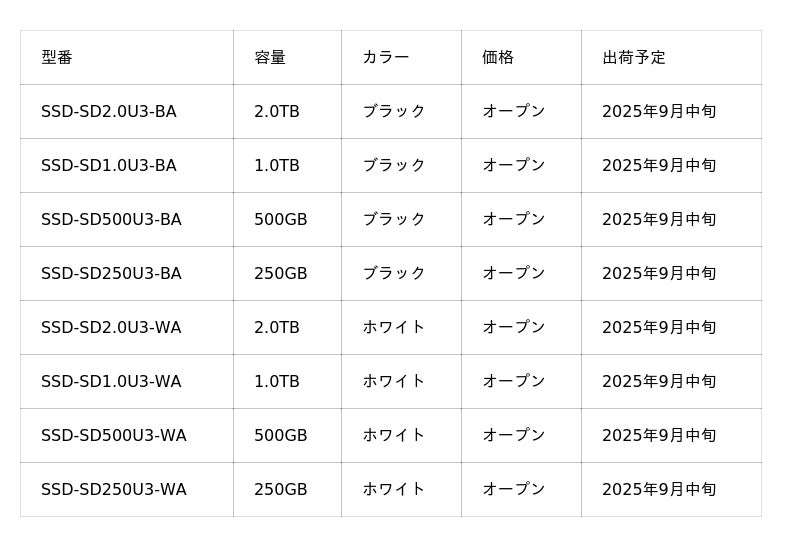 SSD-SDU3シリーズ(容量:2.0TB、1.0TB、500GB、250GB)