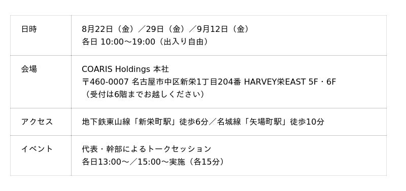 内覧会のお申し込みは、コアリスHDのWebサイト(https://coaris.co.jp/)もしくは、広報担当:犬飼(t.inukai@coaris.co.jp)までお寄せください。