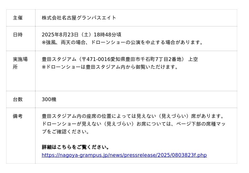 「空飛ぶクルマ」(※1)の開発およびドローン関連サービスを提供する株式会社SkyDrive(本社:愛知県豊田市、代表取締役CEO:福澤知浩、以下「SkyDrive」)は、2025年8月23日(土)に豊田スタジアム(愛知県豊田市)で開催される「明治安田J1リーグ 第27節 名古屋グランパス vs 川崎フロンターレ」において、ドローンショーを実施することをお知らせいたします。