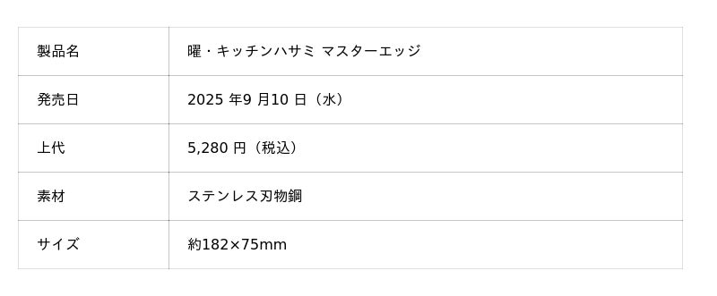 株式会社ヤクセル(本社:岐阜県関市、創業90余年の刃物メーカー)は、刃物のまち・関市の熟練職人による丁寧な手仕事と、現代のニーズに応える機能美を融合させたキッチンハサミ『曜・キッチンハサミ マスターエッジ』を、2025年9月10日(水)より全国の専門店および公式オンラインストア(https://yaxell-store.com)にて販売開始いたします。また、2025年8月22日(金)より公式オンラインストアにて予約販売を開始いたします。