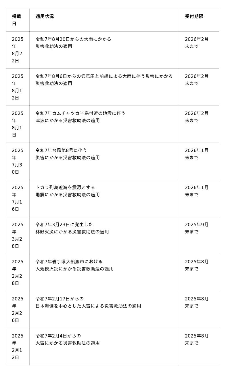 ※災害救助法適用地域の最新情報は内閣府のホームページにてご確認ください。