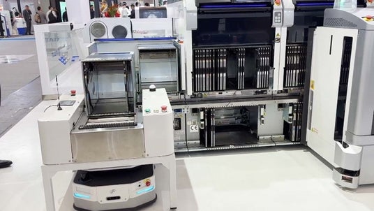 productronica China 2025にて、Standard RobotsのAMR 『Oasis-300E』 が、FUJIの実装機NXTR Aモデルに部品補給用マガジンを搬送