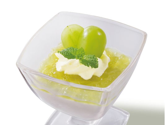 マスカットオブアレキサンドリアのジェラートにシャインマスカットのジュレとレアチーズムースをのせた贅沢な一品。