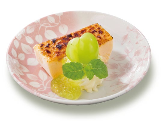 濃厚なカタラーナをキャラメリゼし、シャインマスカットジュレとシャインマスカットの果実、レアチーズムースを添えました。ほろ苦さとみずみずしいシャインマスカットがよく合います。