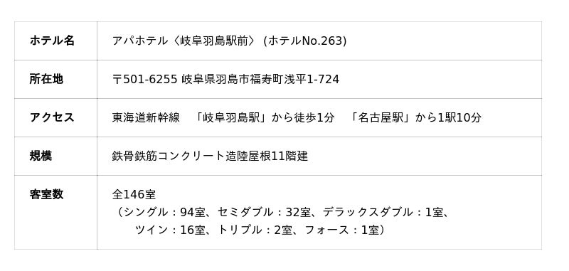 アパホテル〈岐阜羽島駅前〉公式HP:https://www.apahotel.com/hotel/tokai/gifu/gifu-hashima-ekimae/