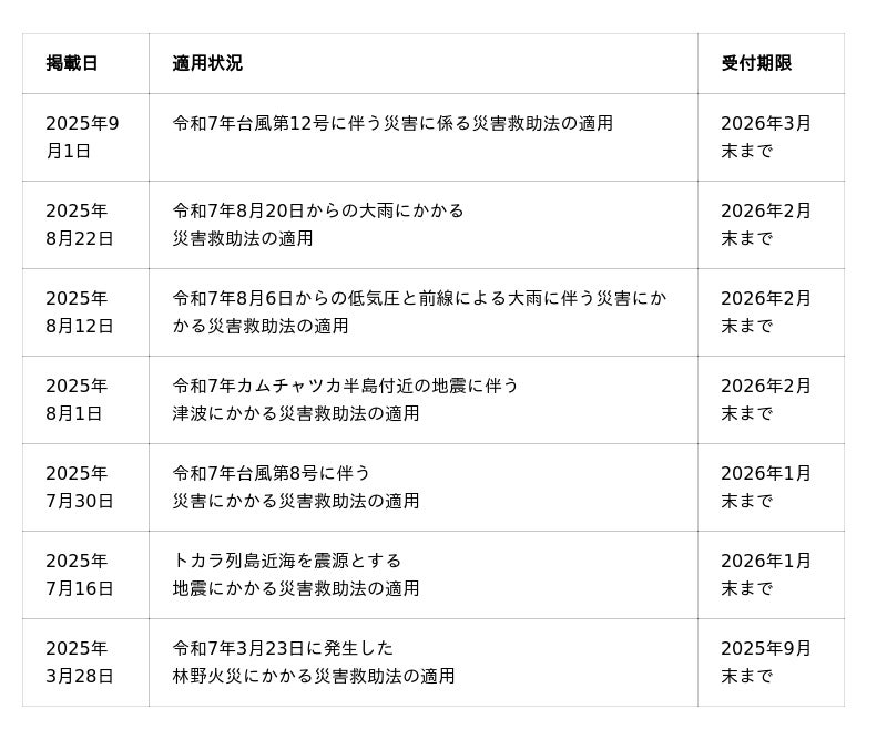 ※申込時の備考、またはその他の連絡事項欄に「令和7年台風第12号」と対象の災害名を記載してください。