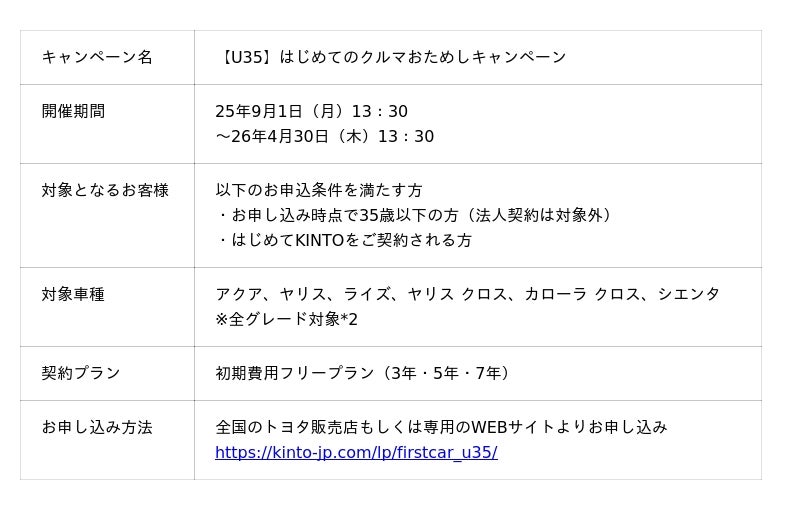 株式会社KINTO(本社:愛知県名古屋市、代表取締役社長:小寺 信也、以下KINTO)は、25年6月に地域限定で実施した「【U29応援】カーライフおためしキャンペーン」の反響を受け、対象車種・対象年齢を拡大した「【U35】はじめてのクルマおためしキャンペーン」を25年9月1日(月)より全国で実施します。