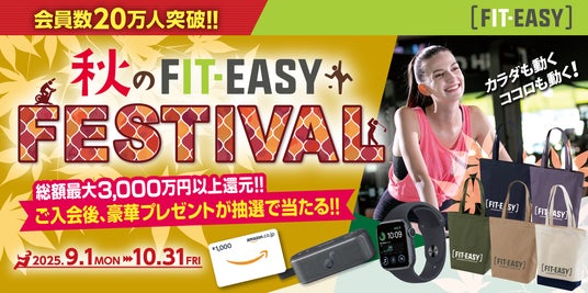 全国にアミューズメントフィットネスクラブを展開するフィットイージー株式会社(本社:岐阜市、以下:当社)は、このたび会員数20万人を突破いたしました。 そこで、会員様と新規入会者様に日頃の感謝の気持ちをお伝えするため、豪華プレゼントやこのタイミングだけのお得な入会キャンペーンを実施する「秋のFIT-EASY FESTIVAL」を実施いたします。